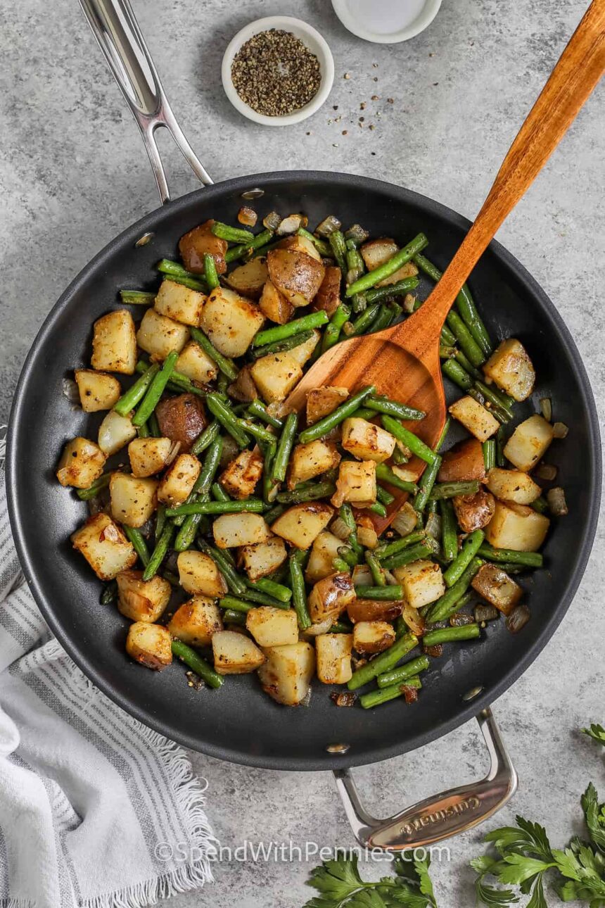 Šis šparaginių pupelių ir bulvių receptas yra paprastas ir kvapnus garnyras su minkštomis bulvėmis, šviežiomis šparaginėmis pupelėmis ir pikantiškų prieskonių mišiniu,